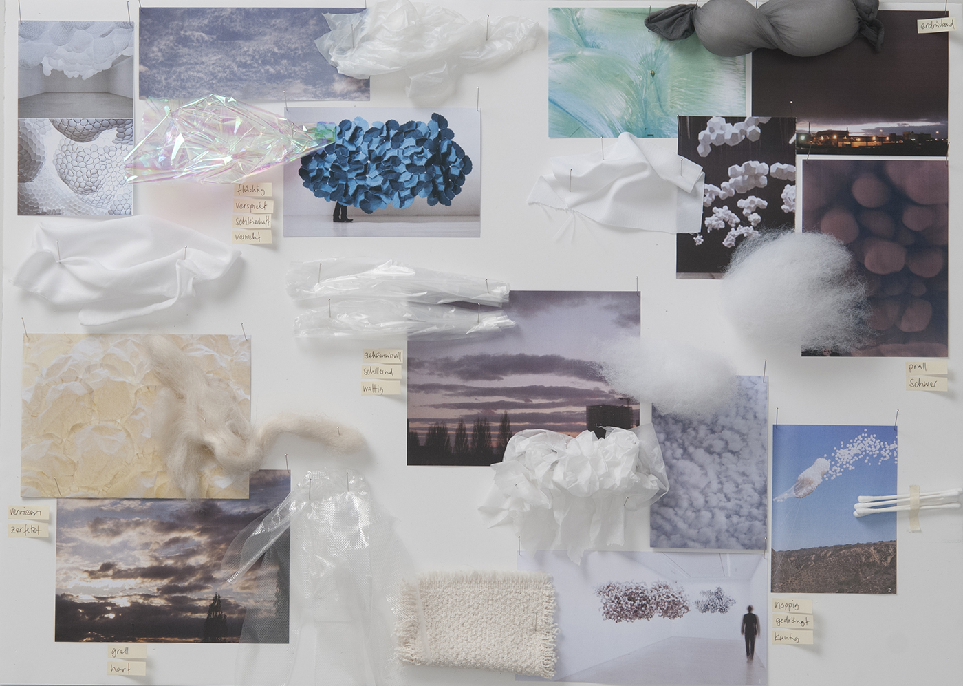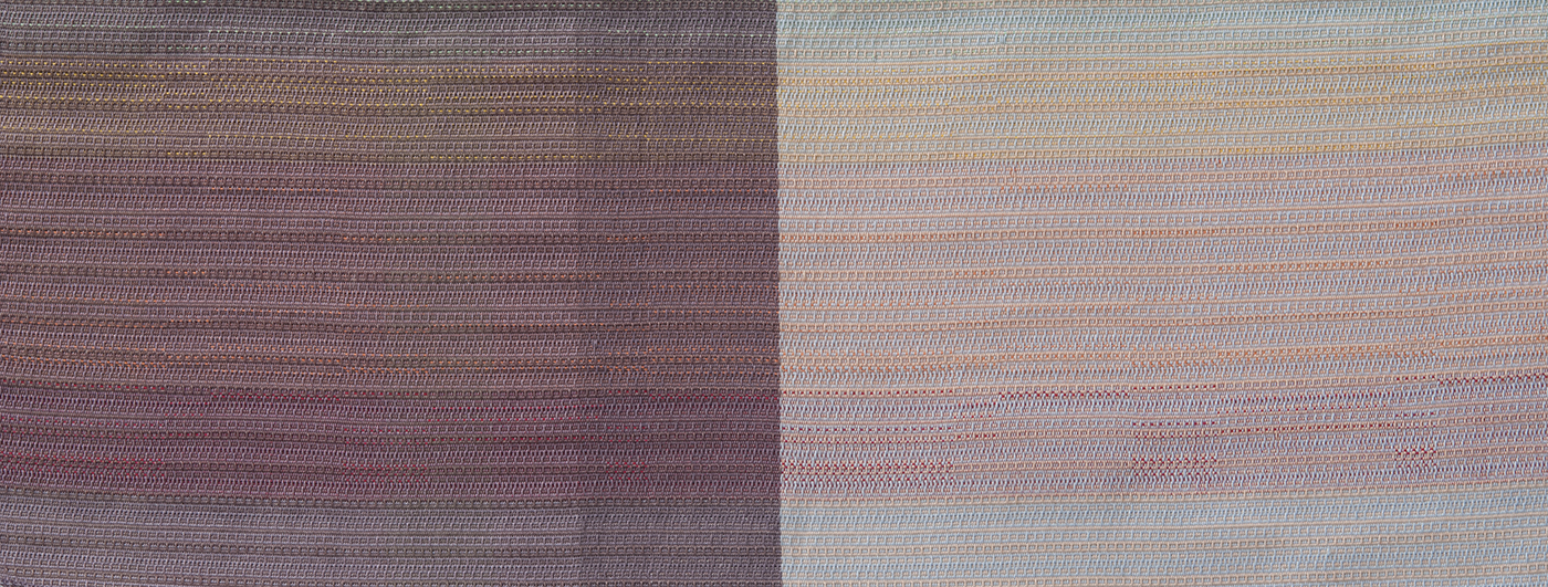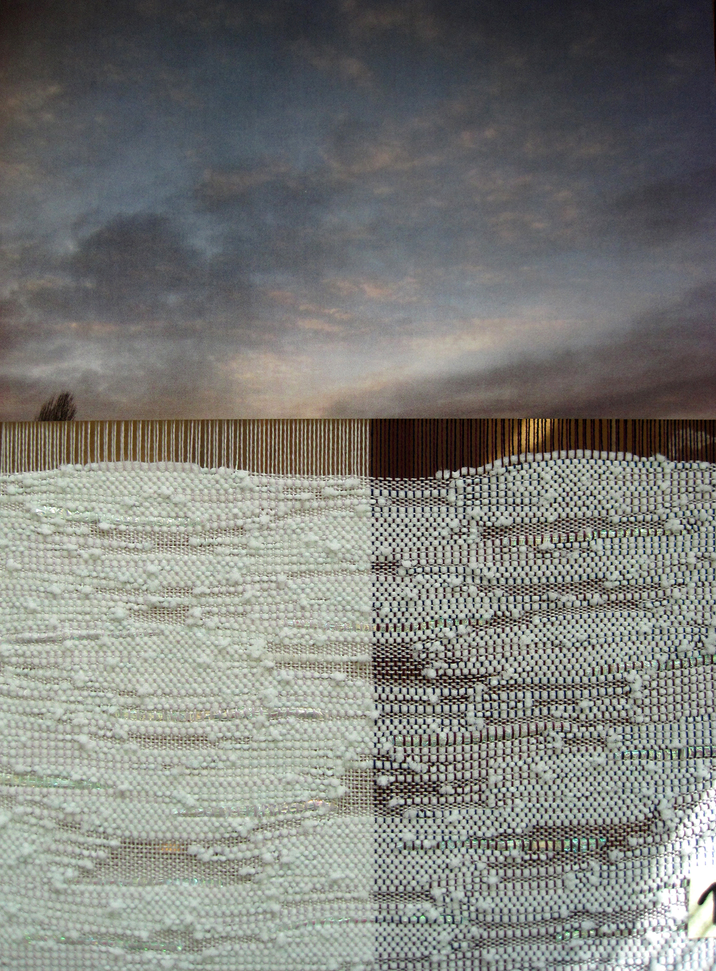 Farben und Materialien verwob ich zu Textilien, die den Himmel mal an einem flirrenden Sommertag, in der Abenddämmerung oder als drückende Gewitterdecke erscheinen liessen. Als Ausgangslage dienten mir eigens fotografierte Bilder des sich immer wandelnden, so vielfältigen Himmels.