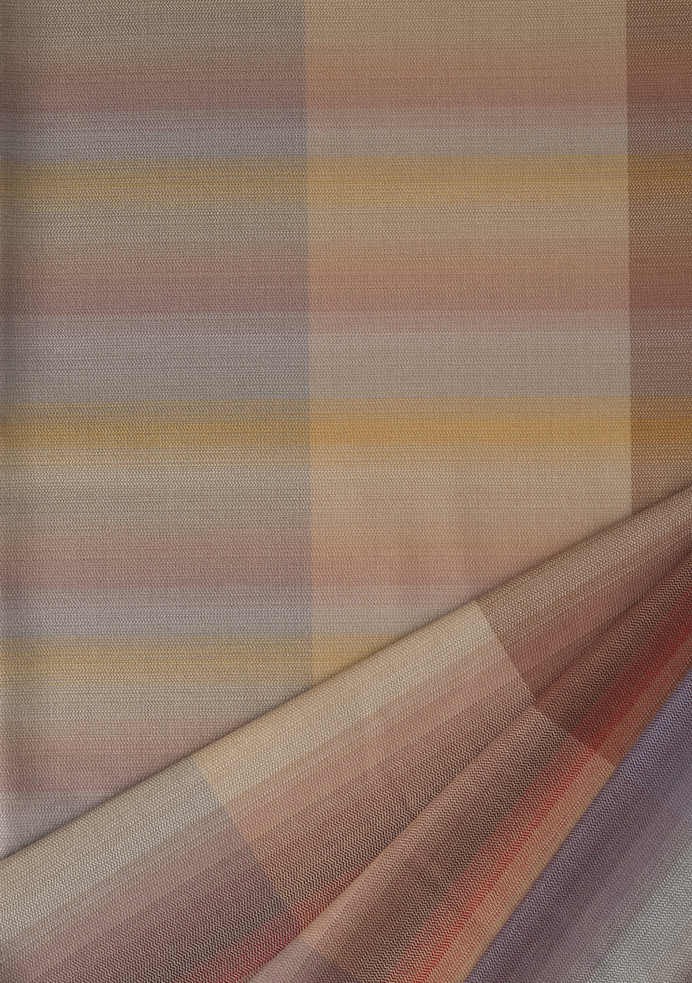 Einerseits entstanden experimentelle Stücke die sich durch ihre Habtik und Materialien dem Himmel annähern, andererseits feinstrukturierte Stoffe, deren lange Muster- und Farbrapporte der Weite des Himmels Ausdruck verleihen. Einige Entwürfe konnte ich in der Industrieweberei von der Firma Lantal Textiles AG auf einer bestehenden Kette abweben lassen.