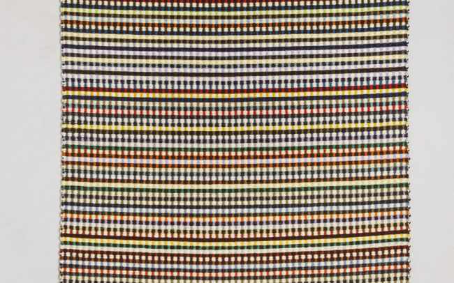 Das Muster basiert auf einem strengen, schwarz-weissen Grundraster aus Schweizer Schafwolle, welches durch die zufällige Anordnung des farbigen Ziegenhaars spielerisch und rhythmisch aufgelockert wird.