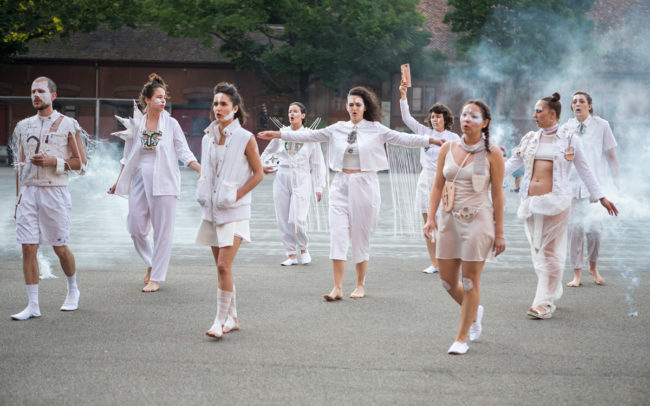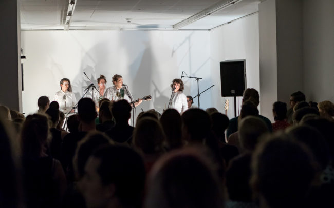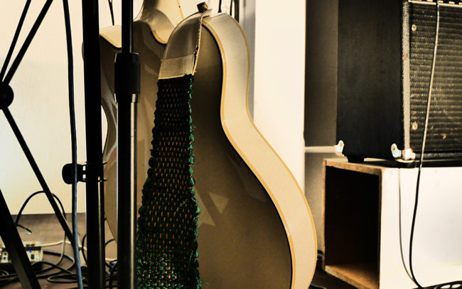Zwei Bands werden neu gegründet und geben gleichzeitig, im selben Raum, ihr erstes und einziges Konzert. Ein Kollektivprojekt, bei welchem verschiedenste Menschen ihren Beitrag dazugeben; von Songtexten und Performen über Knowhow bis hin zu den Kostümen. Mein Anteil sind vier Gitarrengurte.
